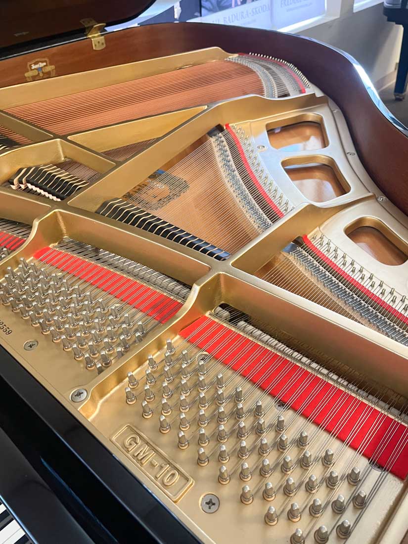 The Kawai GM-10 is a 5’0″ (150cm) baby grand piano known for premium features in a compact size, boasting an Ultra-Responsive™ Action with carbon composite parts (like the carbon jack) for speed, a solid spruce soundboard for rich tone, maple hammer mouldings, underfelted hammers, and a rare full sostenuto pedal (usually on larger grands) for expressive control. It offers great value, and provides a responsive, powerful sound for its size, making it an excellent choice for home use.
